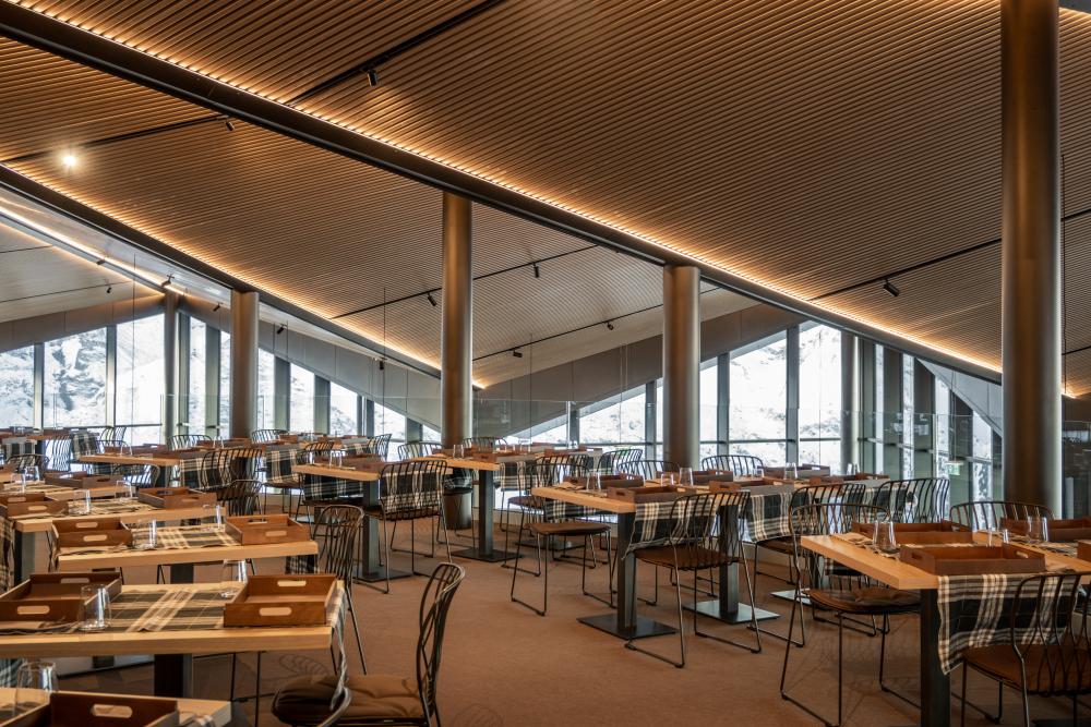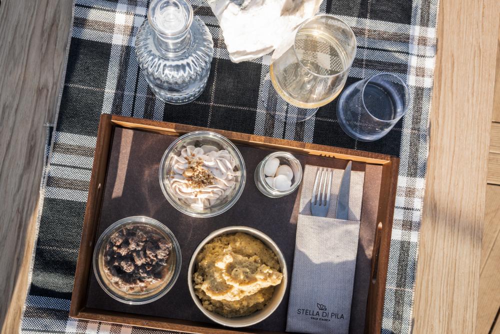 The Stella di Pila welcomes guests with an essential and refined style signed by Skyway Monte Bianco: from breakfast to aperitif, from buffet lunch to hot or cold drinks served at the bar, all the way to delicious stuffed potatoes. Everything is accompanied by a selection of wines from the Aosta Valley for a food and wine experience in contemplation of the surrounding landscape.